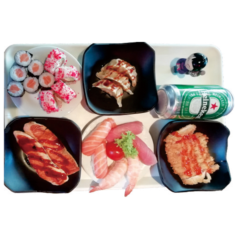 | 1 gebakken nasi, 3 chicken gyoza, 4 mini loempia 4 tuna salad maki, 6 zalm maki, 2 zalm nigiri 2 tonijn nigiri, 2 garnaal nigiri, 1 drankje |